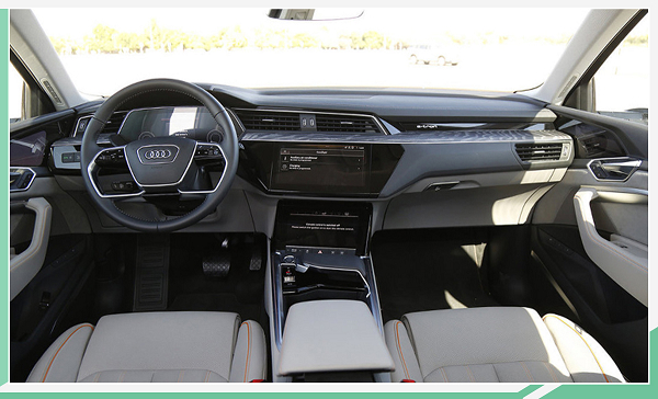 在内饰方面,奥迪e-tron配备有全液晶仪表盘,以及最新的MMI触摸响应操作系统,其提供有10.1英寸和8.6英寸两块屏幕;四幅式方向盘样式比较新颖,并搭配多功能按键,使得操作更加便捷。