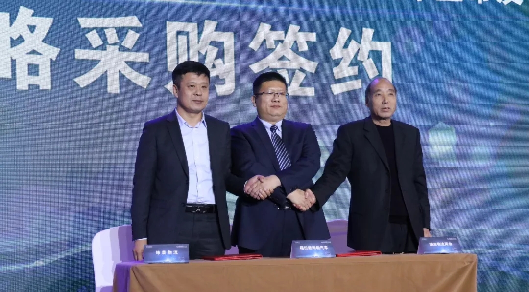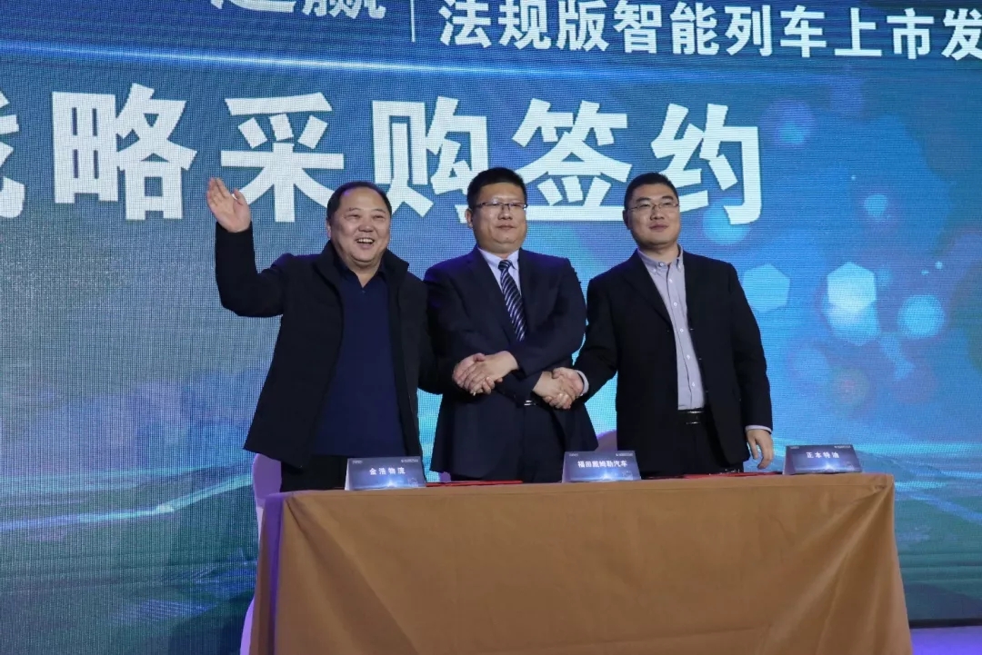 福田戴姆勒汽车营销公司副总经理王维分别与山东金浩物流有限责任公司董事长王敏,山东正本特种油运输有限公司董事长王成程,辽宁缘泰物流有限公司总经理高殿坤,河南济源物流商会会长赵永忠签订安全之星法规版智能列车战略采购协议共350台
