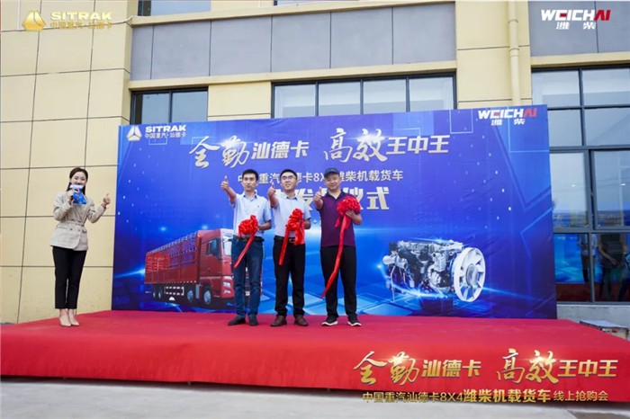 现场重汽厂家代表、潍柴厂家代表、经销商代表共同剪彩,宣布中国重汽汕德卡8×4潍柴机载货车正式上市!