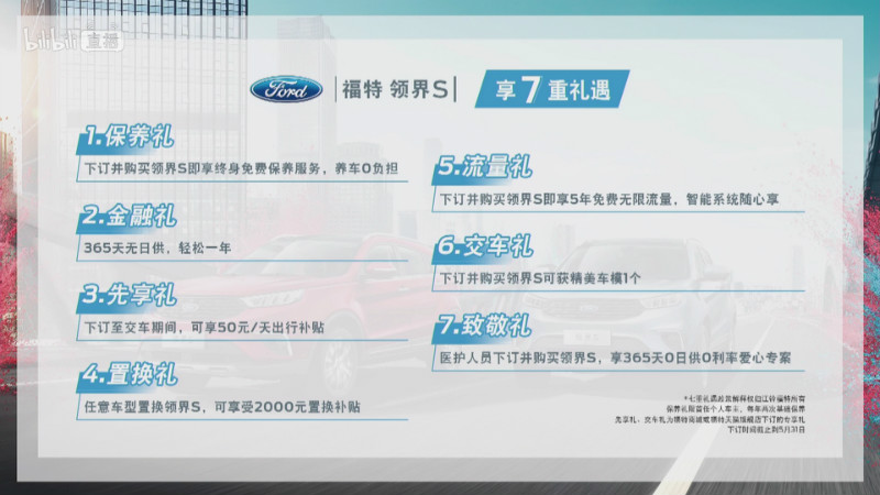 据介绍,在5月31日前下订福特领界S的消费者,即可享受七重礼遇:终身免保养、365天无日供、2000元置换补贴、下订到交车50元日补贴、5年免费无限流量、领界S车模1套、医护人员365天0日供0利率购车专享。