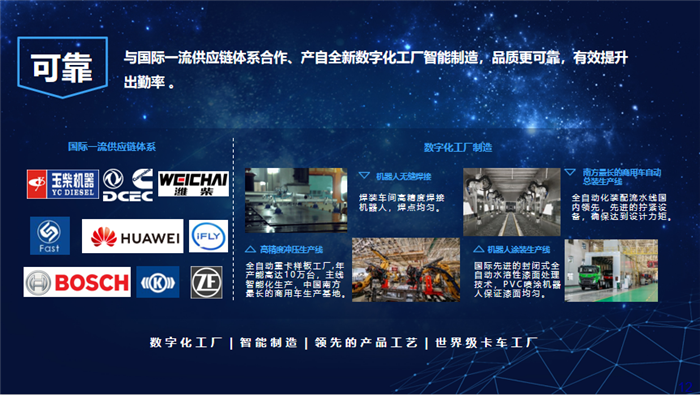 此外,通过与玉柴、康明斯、潍柴、法士特、华为、博世、采埃孚等国际一流供应链体系合作构建技术生态圈,产品品质更可靠,有效提升出勤率 。