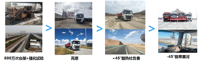 在此基础上,乘龙H7 3.0历经严苛全工况验证,包括 800万次台架+强化试验,高原,+45°C酷热吐鲁番,-45°C极寒黑河各种极端工况验证,只为提供更为可靠的运输解决方案。