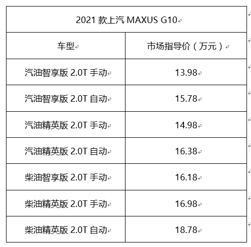 6月10日,国内首款兼具汽油与柴油双动力组合的MPV ——2021款上汽MAXUS(迈克萨斯)G10正式上市,官方指导售价为13.98万元-18.78万元,以全新升级的产品力进一步满足用户需求。2021款G10产品包含精英版和智享版车型,以及由此拓展而来的营运版和专用版车型,囊括了汽油和柴油两种燃油动力。以13.98万元起的亲民售价,于群雄逐鹿的市场竞争中抢占了先机。