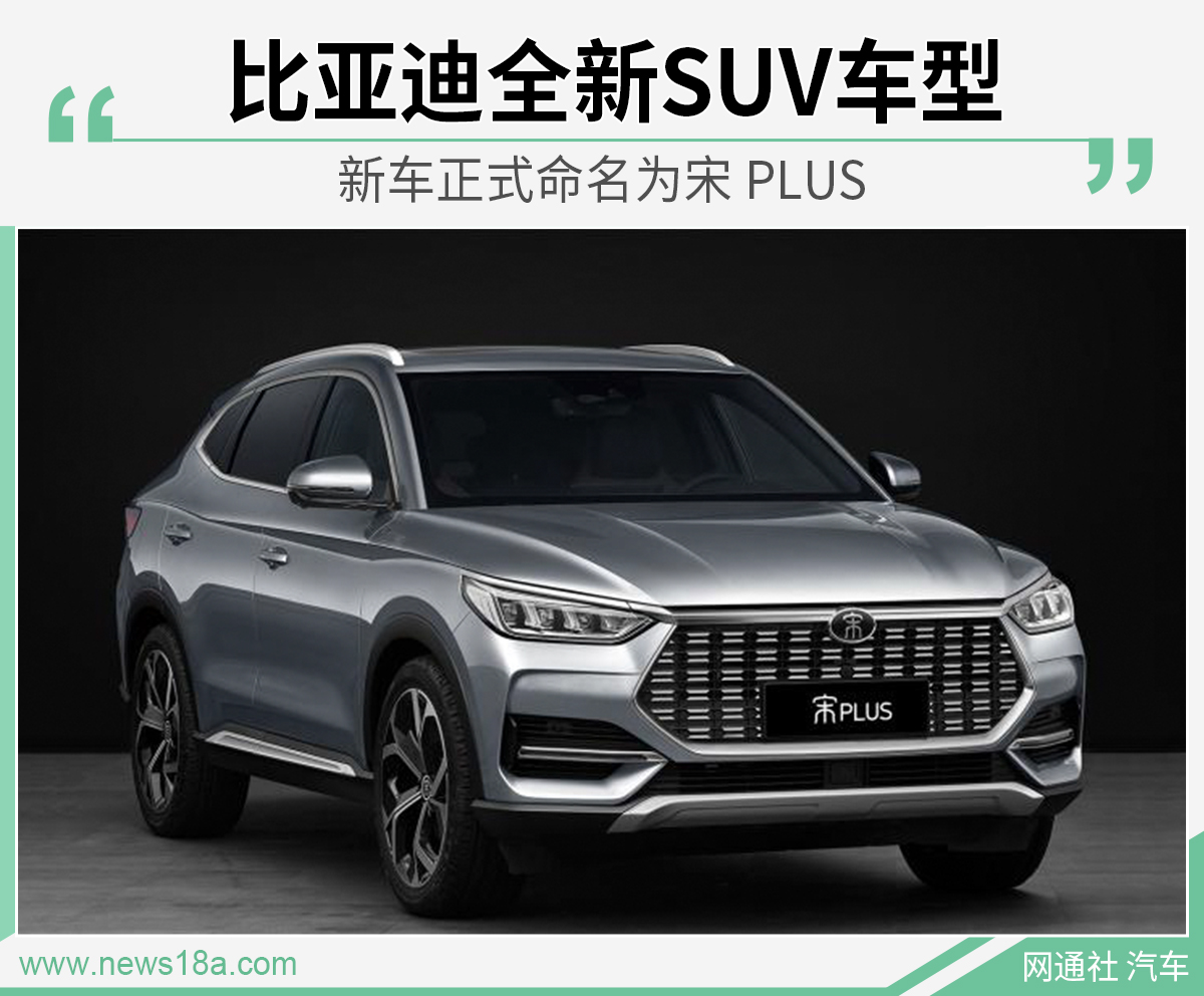 近日,网通社从比亚迪官方获悉,旗下全新SUV车型正式命名为宋 PLUS,除此之外全新车型拥有纯电版本命名为宋 PLUS