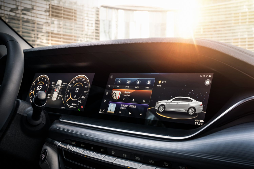 车内搭载双12.3英寸联屏,仪表盘和中控屏可实现互联,地图导航等功能可完整地在仪表盘显示。该套中控搭载ADiGO智能物联系统,在满足一般多媒体功能的同时也加入了更多的智能配置,例如通过专属ID账号,进行用户身份识别,满足个性化需求。通过语音控制识别系统可以控制天窗、车窗和空调、座椅通风加热等等。