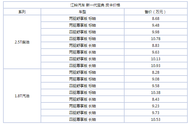 2020年8月25日,2020款江铃宝典正式上市。新车共推出16款车型,售价区间为8.28-10.93万元。江铃新宝典是一款基于域虎3打造的皮卡车型,新车提供了舒享版/尊享版两个配置,另外搭配两驱/四驱以及2.5T柴油/1.8T汽油各种组合,共推出了16款车型,具体车型以及对应价格参见下表: