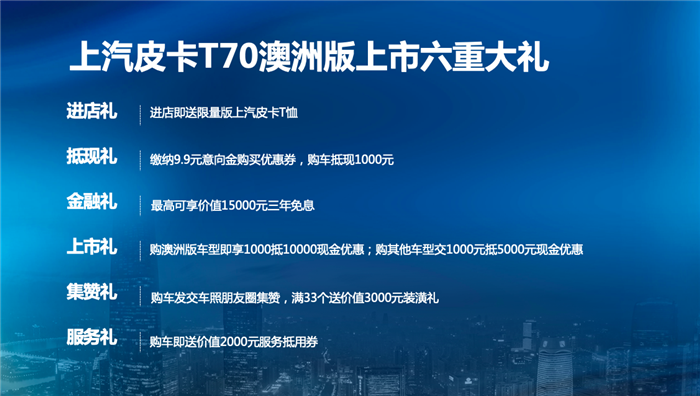 不止是令人震撼的新车发布,上汽大通MAXUS还为购买T70澳洲版的用户精心准备最高3万元的6重购车大礼包,包括金融礼(最高享价值15000元三年免息)、上市礼(最高享交1000元抵10000元现金优惠)、集赞礼(在朋友圈发布交车照并集赞,积满33个赞享价值3000元装潢礼)、服务礼(购车享价值2000元服务抵用券)、抵现礼(支付9.9元意向金购买优惠券,购车可抵现1000元)以及进店礼(进店即享限量版上汽大通MAXUS皮卡T恤),为消费者提供贴心全面的购车福利。