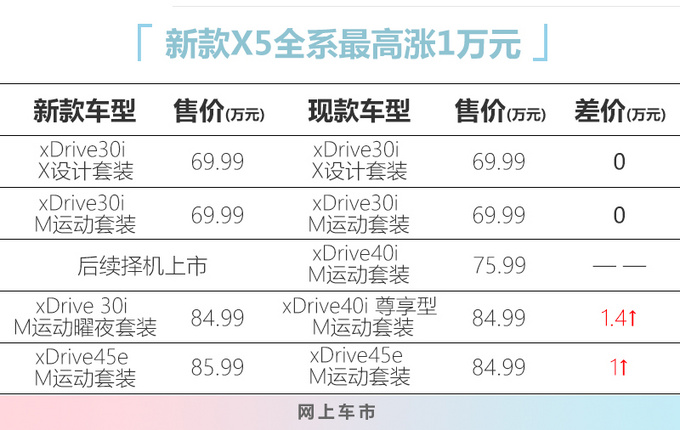 从宝马经销商处获悉,新款(2021款)X5将推出3款燃油版车型和1款插电混动版车型,售价区间为69.9-86.39万元。与现款车型相比,新款X5燃油版顶配车型价格上调1.4万元,同时新车还对车型配置进行了调整,另外X5