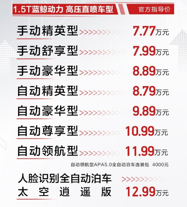 动力方面,新车全系搭载蓝鲸1.5T发动机,最大功率178Ps,最大扭矩265N·m。与发动机匹配的传动系统为6速手动变速箱或7双离合变速箱。