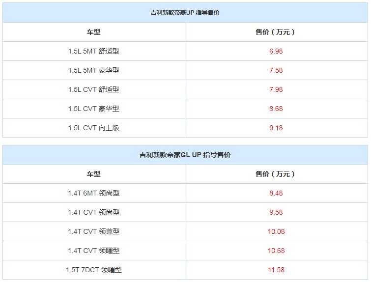 UP共推出5款车型,售价区间为8.48-11.58万元。作为年代改款车型,两款新车均采用了吉利全新4.0家族化设计语言。此外,在细节工艺、智能、安全等方面也有所提升。关于详细售价,见下表: