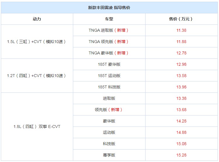 从广汽丰田官方获悉,2021款雷凌家族正式上市,新车有6款纯汽油版车型,售价区间为11.38-13.98万元,还有6款油电混合的双擎版车型,售价区间为13.38-15.28万元。新车增加了全新的1.5L自然吸气三缸发动机,让动力系统多样化,给消费者更多选择。详细车型见下表: