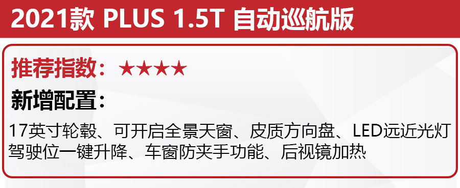 再升级一个配置是自动巡航版,配置增加了17英寸轮毂、可开启的全景天窗以及LED远近光灯等功能,因为价格上升了8000元,整体还算实惠,所以这款是次推荐的车型。