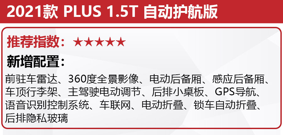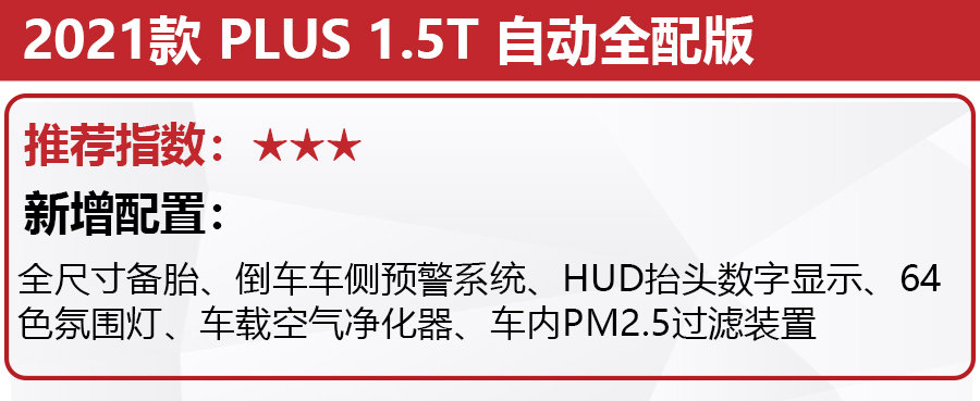 接下来是顶配车型,也就是自动全配版,基本上日常所需的配置这款车型基本都囊括了,比如全尺寸备胎、倒车车侧预警系统、HUD抬头数字显示等等。由于这款车型的售价超过了16万元,因此也不做推荐。
