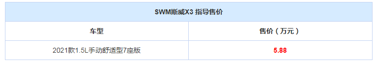 4月25日,SWM斯威X3新增车型——2021款1.5L手动舒适型7座版正式上市,售价5.88万元,新增车型搭载1.5L发动机,配5挡手动变速箱。