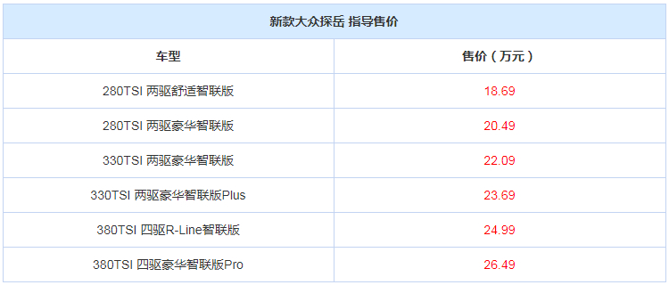 日前,我们从一汽-大众官方获悉,旗下新款探岳车型正式上市,新车共推出6款车型,售价区间为18.69-26.49万元。新车在外观内饰方面变化不大,但在车型配置上进行了一定的优化更新。新车作为年度改款车型,取消了老款的330TSI两驱豪华智联版Pro版本,并新增了330TSI豪华智联版Plus作为替代,并且价格相应的下调了3000元。详细车型见下表: