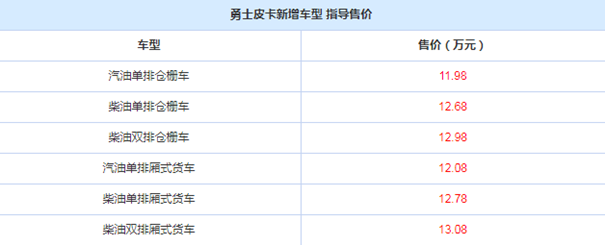 日前我们从官方渠道获悉,北汽制造旗下的勇士皮卡有新增车型上市,新车共分仓栅车与厢式货车两种,产品覆盖汽油、柴油和单排、双排车型,共有6款车型供消费者选择,售价区间为11.98-13.08万元。