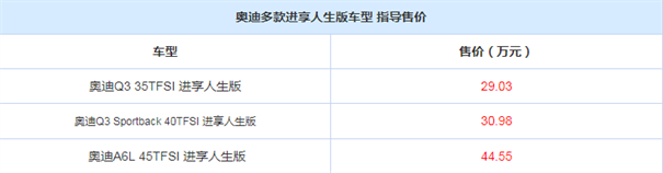 此外,奥迪后续还将推出A3 Sportback、奥迪A3L Limousine、奥迪A4L、奥迪Q5L、奥迪Q5L Sportback等车型的“进享人生版”,配置层面也有多项升级。