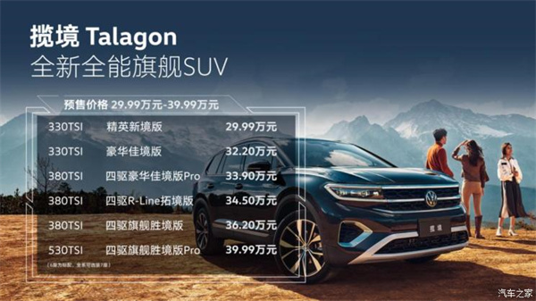 日前,我们从一汽-大众官方了解到,旗下全新中大型SUV——揽境(TALAGON)正式开启预售,新车共推出6款配置车型,预售价区间为29.99-39.99万元。此外,针对预定用户,揽境还推出了5项价值4万元的预售专享政策:1、装备升级礼-限量版提供至高1.5万元装备升级;2、安心无忧礼-非限量版,前1000名享受5000元保险礼包,其他客户可享受等额保养礼包;3、金融支持礼-首付40%起,2年低利率;4、旧焕新礼-一汽-大众新老客户可享至高8000元置换补贴;5、预揽新境礼-从5月31日前预定的用户中随机抽取30组家庭参与西宁-茶卡盐湖“纵享天地之旅”。此外,该车将于6月24日上市。