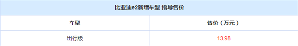 日前,我们从比亚迪官方获悉,旗下纯电动紧凑型车比亚迪e2新增一款出行版车型,售价13.98万元。
