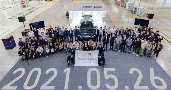 2021年5月26日,ARCFOX极狐与华为合作打造的首款HI版高阶自动驾驶量产车阿尔法S在北汽蓝谷麦格纳镇江工厂正式下线。华为、宁德时代、麦格纳战略合作伙伴共同见证。