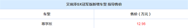 近日,我们从奇瑞官方获悉,艾瑞泽GX冠军版新增一款“尊享版”车型,官方指导价12.98万元。作为新增车型,新车在外观内饰设计上与现款在售车型保持一致,与在售的入门款时尚型相比,尊享版车型新增电动天窗配置,其他则保持不变。动力上,新车将继续搭载1.5L自然吸气发动机。