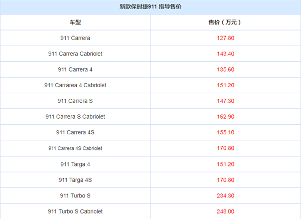 日前,我们从官方获悉,新款保时捷911正式上市。新车共推出12款车型,指导价格区间为127.80-248.00万元。其中,Turbo S系列车型涨价7000元,其余车型均涨1.3万元,新车还针对配置进行小幅度调整,详情见下表: