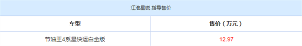 日前,我们从江淮官方获悉,星锐新增节油王4系星快运白金版车型,售价为12.97万元。详细车型见下表: