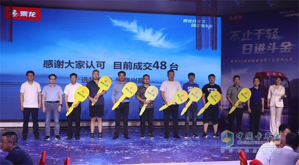 不止于轻,日进斗金!乘龙H5超轻版国六柴油牵引车优势尽显,得力于乘龙H5超轻版的强大优势,发布会现场客户订车48台。