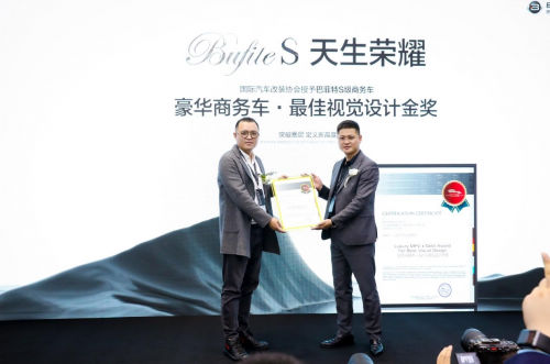 新品发布会上,国际汽车改装协会授予巴菲特S 级商务车-BUFITE S 豪华商务车·最佳视觉设计金奖的荣誉。