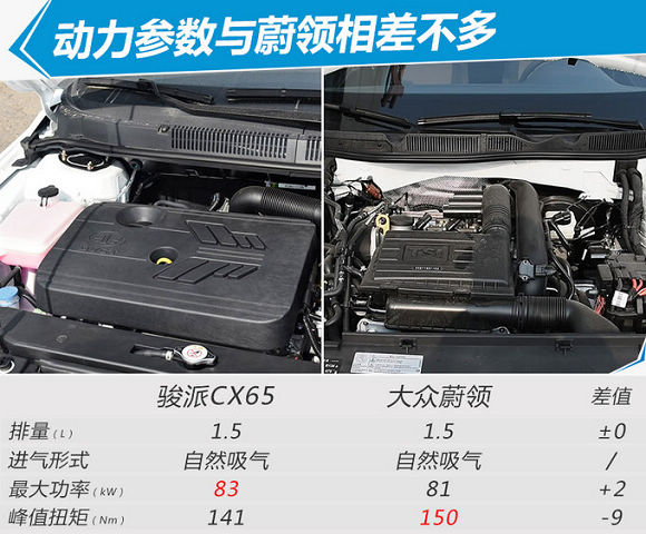 动力方面,骏派CX65搭载一台代号为CA4GA15-01的1.5L自然吸气发动机,最大功率83kW,峰值扭矩141Nm,传动系统匹配5MT变速箱。相比大众蔚领搭载的81kW——1.5L自然吸气发动机,最大功率高出2kW,每百公里综合油耗减少0.2L。车身尺寸方面,新车长宽高分别为4596×1785×1525mm,轴距为2610mm。