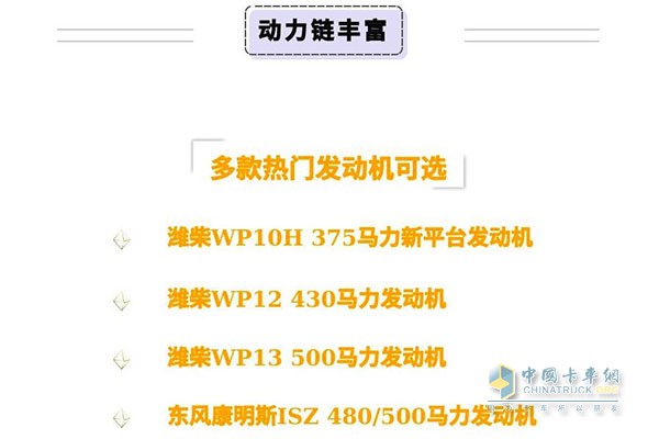 在发动机方面,航天凌河LH4250P有着非常丰富的动力配置可供选择,面对近两年国内物流效率升级带来的需求,大马力发动机备受业内关注,无论是500马力的潍柴WP13,还是480和520马力的东风康明斯ISZ发动机,这两款大排量大马力的发动机在近两年内都经过了市场的严苛检验,树立了不俗的口碑,目前这两款大马力发动机航天凌河LH4250P均可匹配。