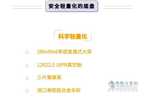18PR真空胎,配套进口美铝铝合金车轮,铝合金材质的储气筒油箱、以及断开式平衡轴及少片簧悬架,经过科学合理的优化,保证安全和承载能力的同时,使得整车轻量化方面具有非常出色的表现。