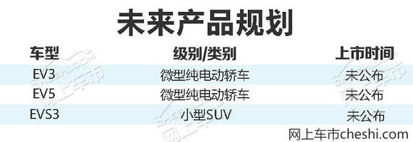 EVS3车身长宽高分别为4100×1650×1548mm,续航里程超358km,最高时速130km/h,电池在快充模式下充满电需要50min,慢充模式下需要8h。另外,新车同样采用四座布局。