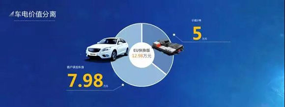 7月5日,北汽新能源在北京正式发布了面向私人市场的车电价值分离商业模式,并推出了其首款对私换电车型——EU快换版。在车电价值分离商业模式下,消费者购买纯电动整车后,电池产权将由电池管理公司回购,消费者以租赁方式获得电池使用权。EU快换版购车费用为7.98万元,电池月租金458元。消费者可根据需要,选择从1200-3000公里的三个级别不同的里程套餐,公里的里程仅需电费0.34元-0.36元。