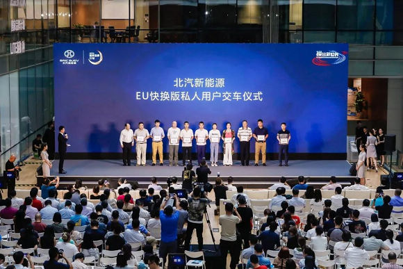 据介绍,为了更好的推动车电价值分离商业模式的落地,北汽新能源还联合奥动、宁德时代、普莱德、优电科技等合作伙伴,发起了卫蓝生态联盟第二期,以开放共享的精神汇聚各方优势,确保新模式行稳致远。除了全新开拓的私人市场,北汽新能源还将继续拓展换电模式在出租车运营市场、旅游市场等领域的推广。在现场,北汽新能源还与宁波小灵狗出行科技有限公司签订10000辆EU快换版的采购订单,双方将共同推动EU快换版车辆在旅游出行生态示范领域的应用。