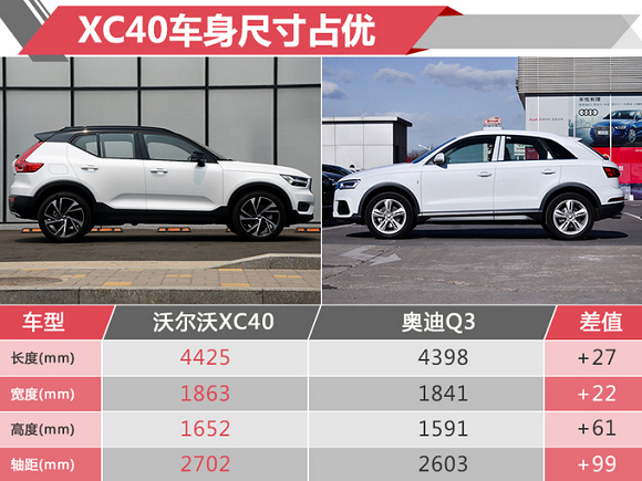 XC40长宽高分别为4425×1863×1652mm,轴距为2702mm,相比奥迪Q3在尺寸方面实现全面超越。新车搭载2.0T涡轮增压发动机,分为高低功率调校(T4、T5),最大功率分别为140kW、180kW,峰值扭矩分别为300Nm、350Nm,最大功率优于奥迪Q3,并标配第五代博格华纳全时四驱系统。传动系统方面,新车匹配8速自动变速箱。