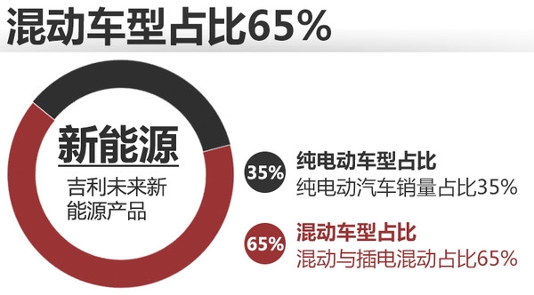 吉利汽车此前宣布,到2020年,新能源汽车销量将占其整体销量的90%以上;其中,插电式混动与油电混动汽车销量占比达到65%,纯电动汽车销量占比达35%;这意味在未来吉利汽车在国内销售的绝大部分车型将是新能源车。届时,旗下产品的油耗将远低于百公里5升的限制,提前满足国家法规要求。