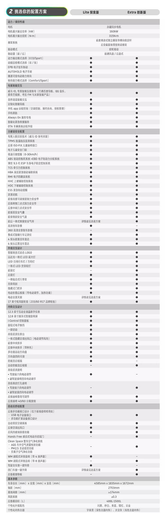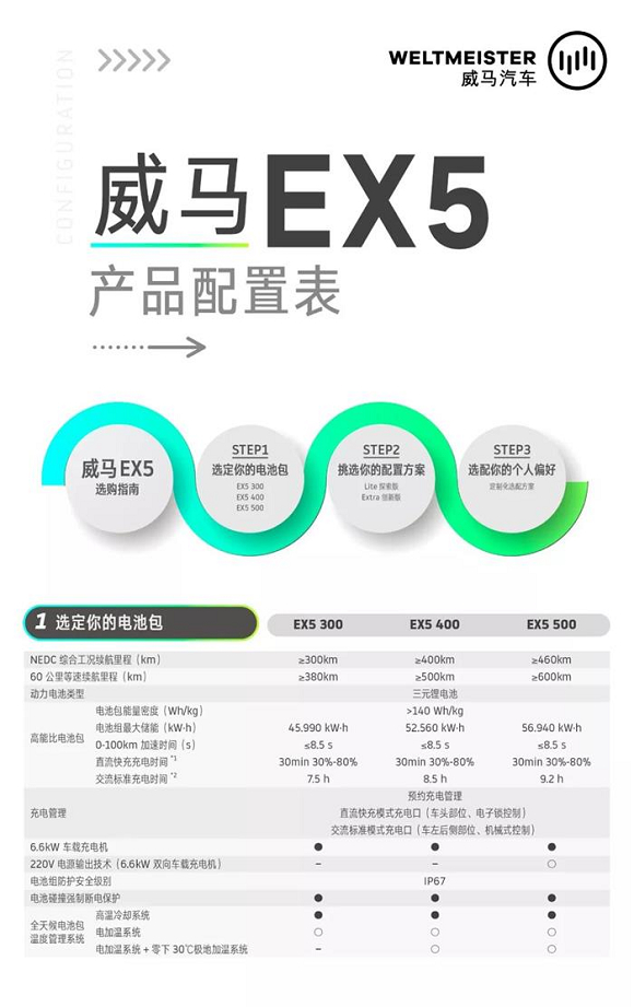 作为威马汽车的首款量产车型,威马EX5不仅推出了300/400/500km三款不同续航里程的车型,还在此基础上,新添了Lite探索版和Extra创新版两种基础车款以及丰富的个性化选配清单,消费者可以从电池包、配置方案、个人偏好三个层面选择选择自己喜欢的车型配置。