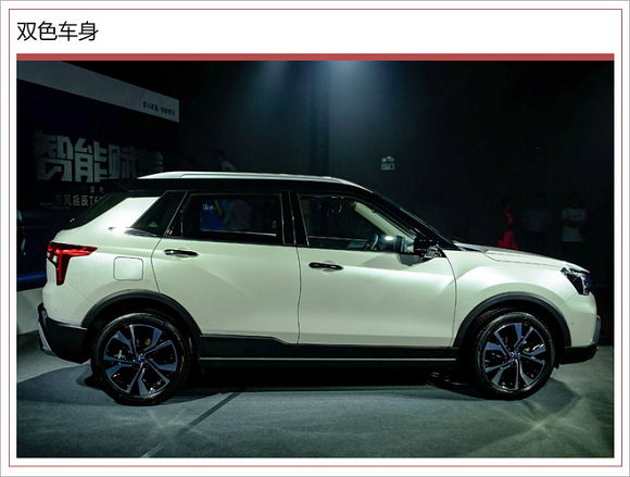 这款SUV采用双色车身涂装,锋利的腰线一直延伸至车尾,搭配大尺寸双色运动轮圈,颇具运动气息。此外,悬浮式车顶上方还装配了银色行李架。车身尺寸方面,新车长宽高分别为4412、1820、1679毫米,轴距达2640毫米。
