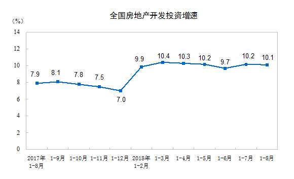 2018年1-8月份,全国房地产开发投资76519亿元,同比增长10.1%,增速比1-7月份回落0.1个百分点。其中,住宅投资54114亿元,增长14.1%,增速回落0.1个百分点。住宅投资占房地产开发投资的比重为70.7%。