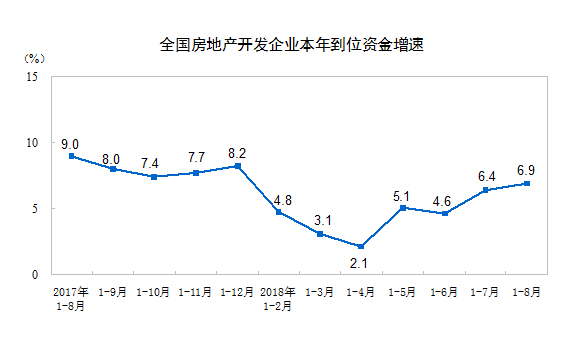 1-8月份,房地产开发企业到位资金106682亿元,同比增长6.9%,增速比1-7月份提高0.5个百分点。其中,国内贷款15783亿元,下降6.6%;利用外资35亿元,下降68.3%;自筹资金34959亿元,增长11.2%;定金及预收款35447亿元,增长15.1%;个人按揭贷款15605亿元,下降1.0%。