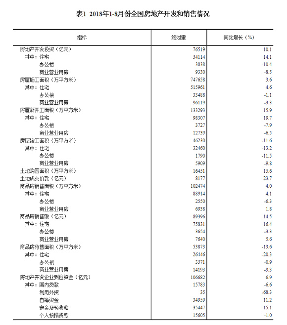 1-8月份,商品房销售面积102474万平方米,同比增长4.0%,增速比1-7月份回落0.2个百分点。其中,住宅销售面积增长4.1%,办公楼销售面积下降6.3%,商业营业用房销售面积增长1.8%。商品房销售额89396亿元,增长14.5%,增速提高0.1个百分点。其中,住宅销售额增长16.4%,办公楼销售额下降3.3%,商业营业用房销售额增长5.6%。