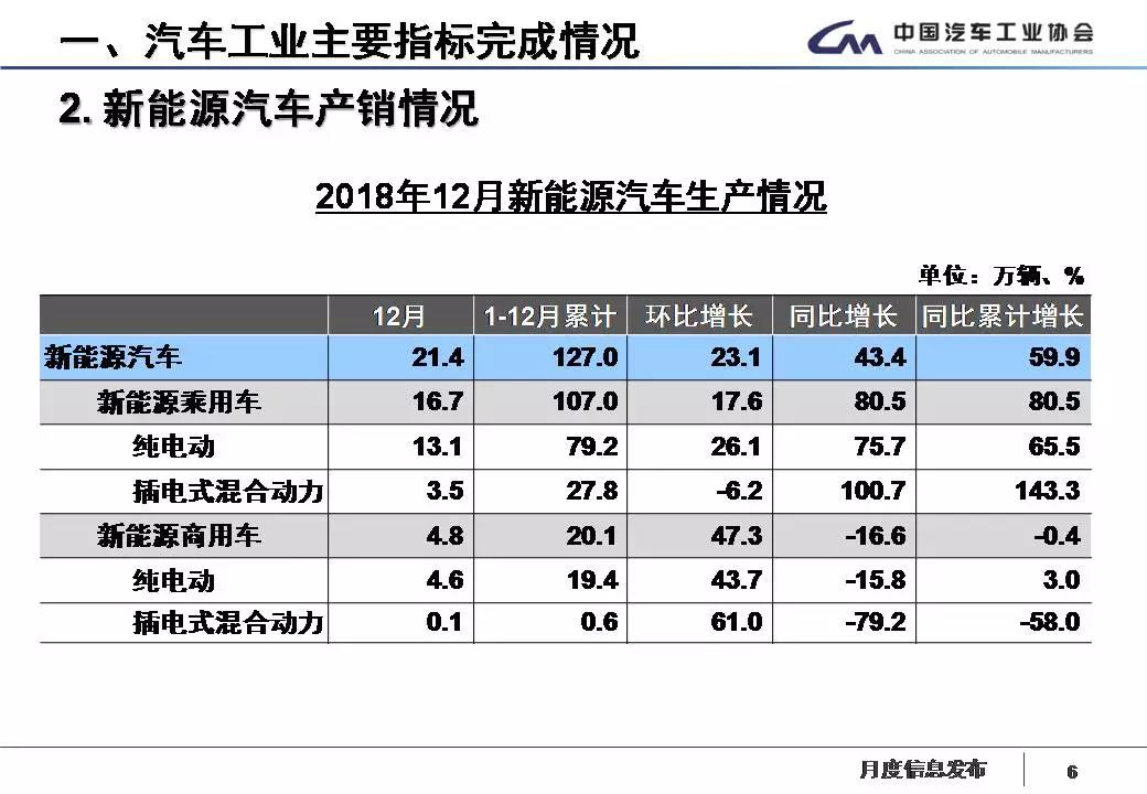 2018年,新能源汽车产销分别完成127万辆和125.6万辆,比上年同期分别增长59.9%和61.7%。其中纯电动汽车产销分别完成98.6万辆和98.4万辆,比上年同期分别增长47.9%和50.8%;插电式混合动力汽车产销分别完成28.3万辆和27.1万辆,比上年同期分别增长122%和118%;燃料电池汽车产销均完成1527辆。