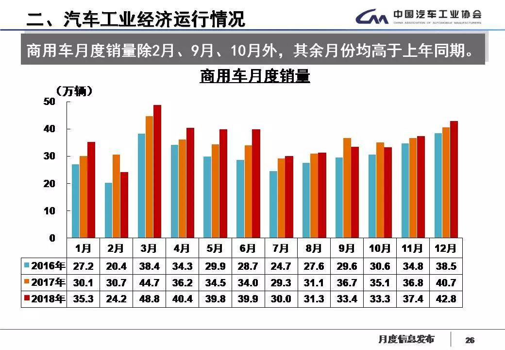 2018年,商用车产销同比继续呈现增长,增速明显回落。受货车市场增长拉动,商用车销量创历史新高。商用车产销分别达到428万辆和437.1万辆,比上年同期分别增长1.7%和5.1%,增速分别回落12.1个百分点和8.9个百分点。商用车月度销量除2月、9月、10月外,其余月份均高于上年同期。