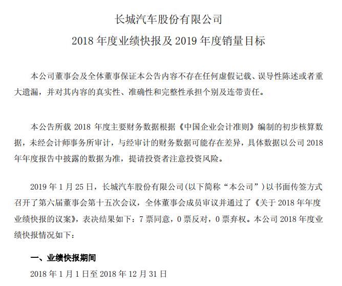 长城汽车2018年净利润53.95亿元 挑战2019年120万销量