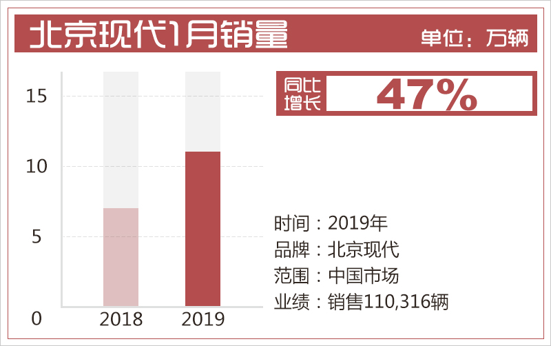 2019年首月,北京现代市场表现呈现出大幅上扬的趋势。2月1日,从北京现代官方获悉,2019年1月,北京现代新车销量突破11万辆,同比大增47%,菲斯塔、领动、新一代i35等车型均取得了亮眼的成绩。根据规划,北京现代今年还将推出8款新产品,有望进一步促进销量的持续增长。