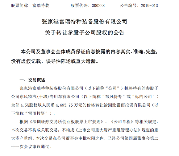 2019年2月18日晚间,富瑞特装披露了《关于转让参股子公司股权的公告》,拟将持有的参股子公司东风特汽(十堰)专用车有限公司(东风特专)全部4.5%股权,以人民币4695.75万元的价格,转让给湖北雷雨投资有限公司(雷雨投资),转让标的东风特专是国内最大的电动商用车整车制造厂商之一。