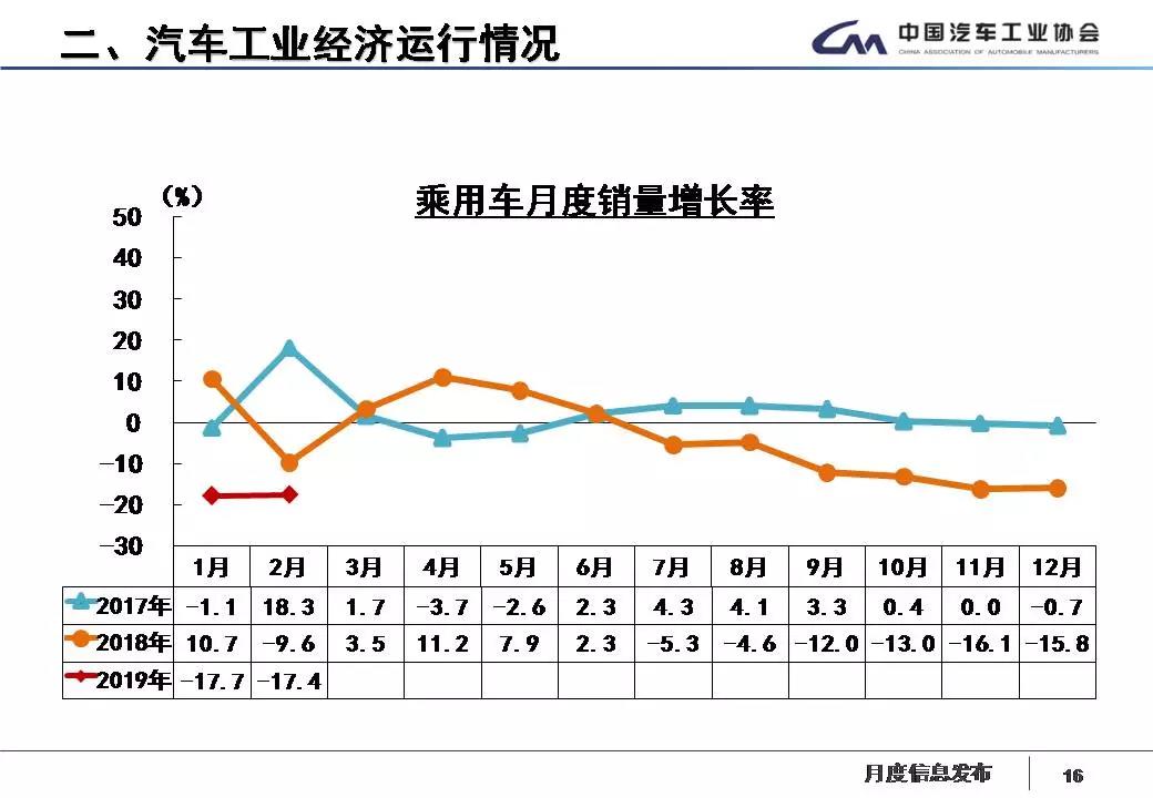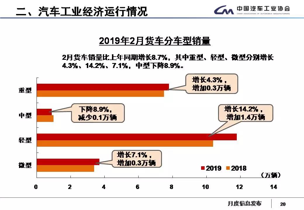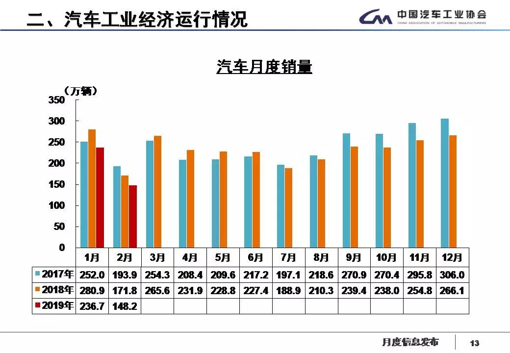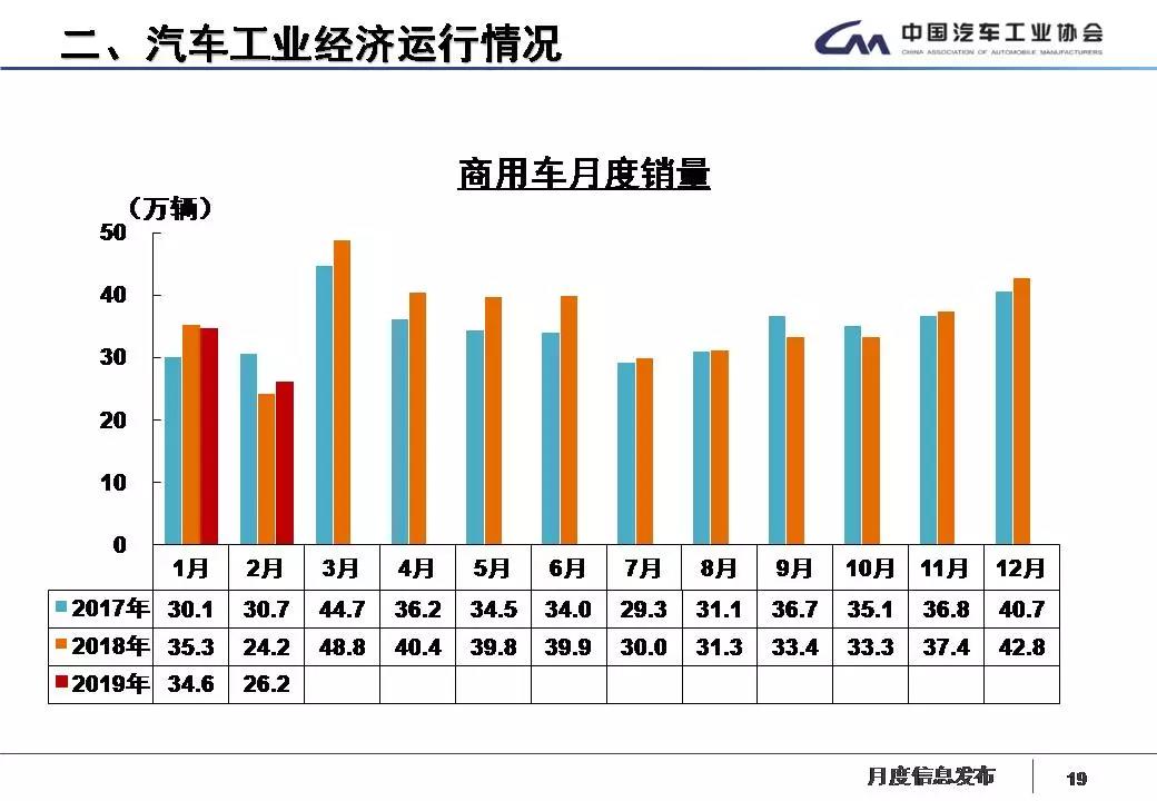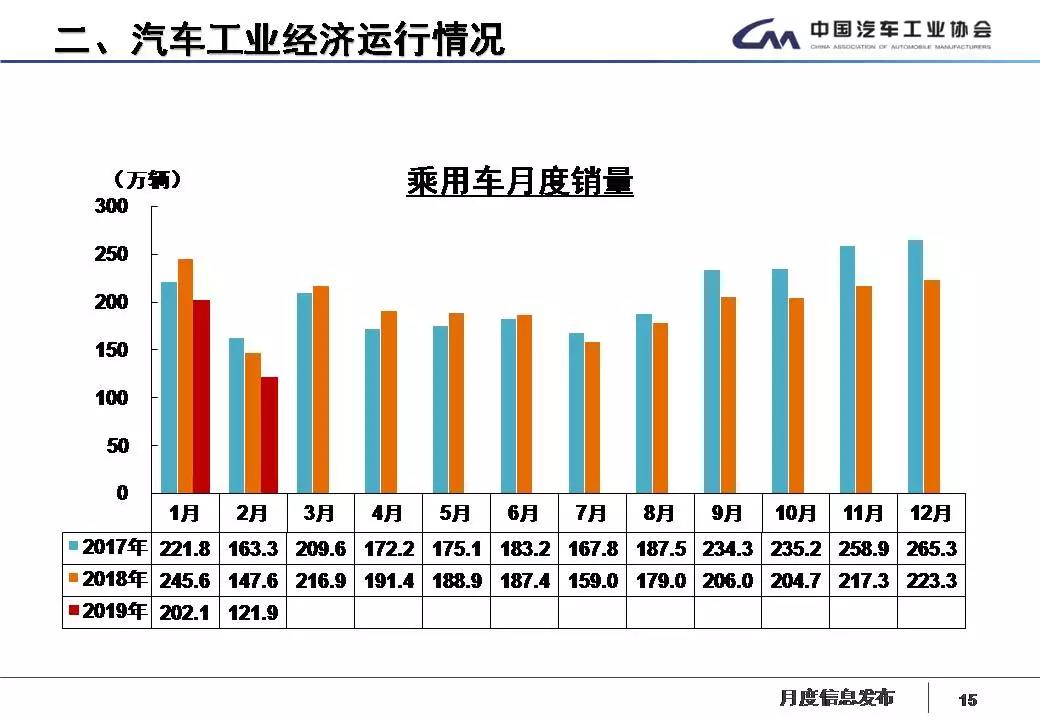 据中国汽车工业协会统计分析,2019年2月,受春节长假因素影响,汽车产销环比呈较快下降,乘用车降幅更为明显,与上年同期相比,商用车产销呈小幅增长,乘用车有所下降。1-2月,汽车产销延续了下降趋势,乘用车降幅高于行业,商用车产销略有增长。具体分析如下: