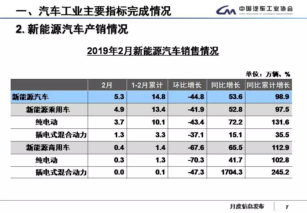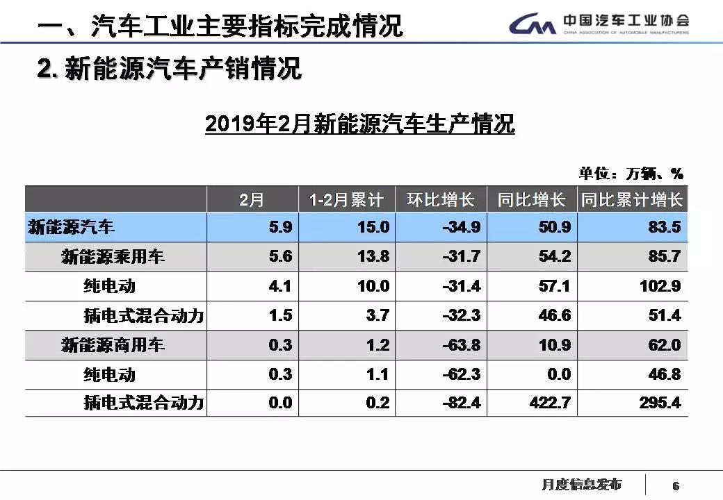 2月,新能源汽车产销分别完成5.9万辆和5.3万辆,比上年同期分别增长50.9%和53.6%。其中纯电动汽车产销分别完成4.4万辆和4.0万辆,比上年同期分别增长51.3%和69.4%;插电式混合动力汽车产销分别完成1.5万辆和1.3万辆,比上年同期分别增长48.2%和18.6%。