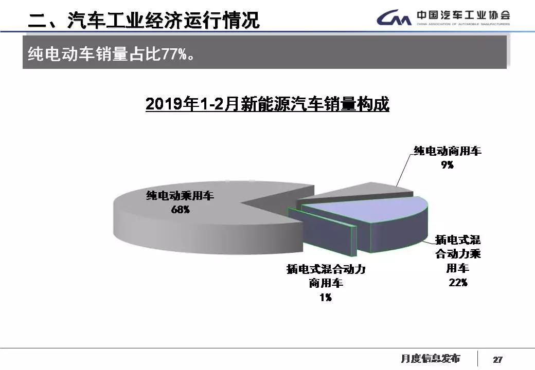 1-2月,新能源汽车产销分别完成15万辆和14.8万辆,比上年同期分别增长83.5%和98.9%。其中纯电动汽车产销分别完成11.1万辆和11.4万辆,比上年同期分别增长95.7%和127.9%;插电式混合动力汽车产销分别完成3.9万辆和3.4万辆,比上年同期分别增长55.2%和38.5%。